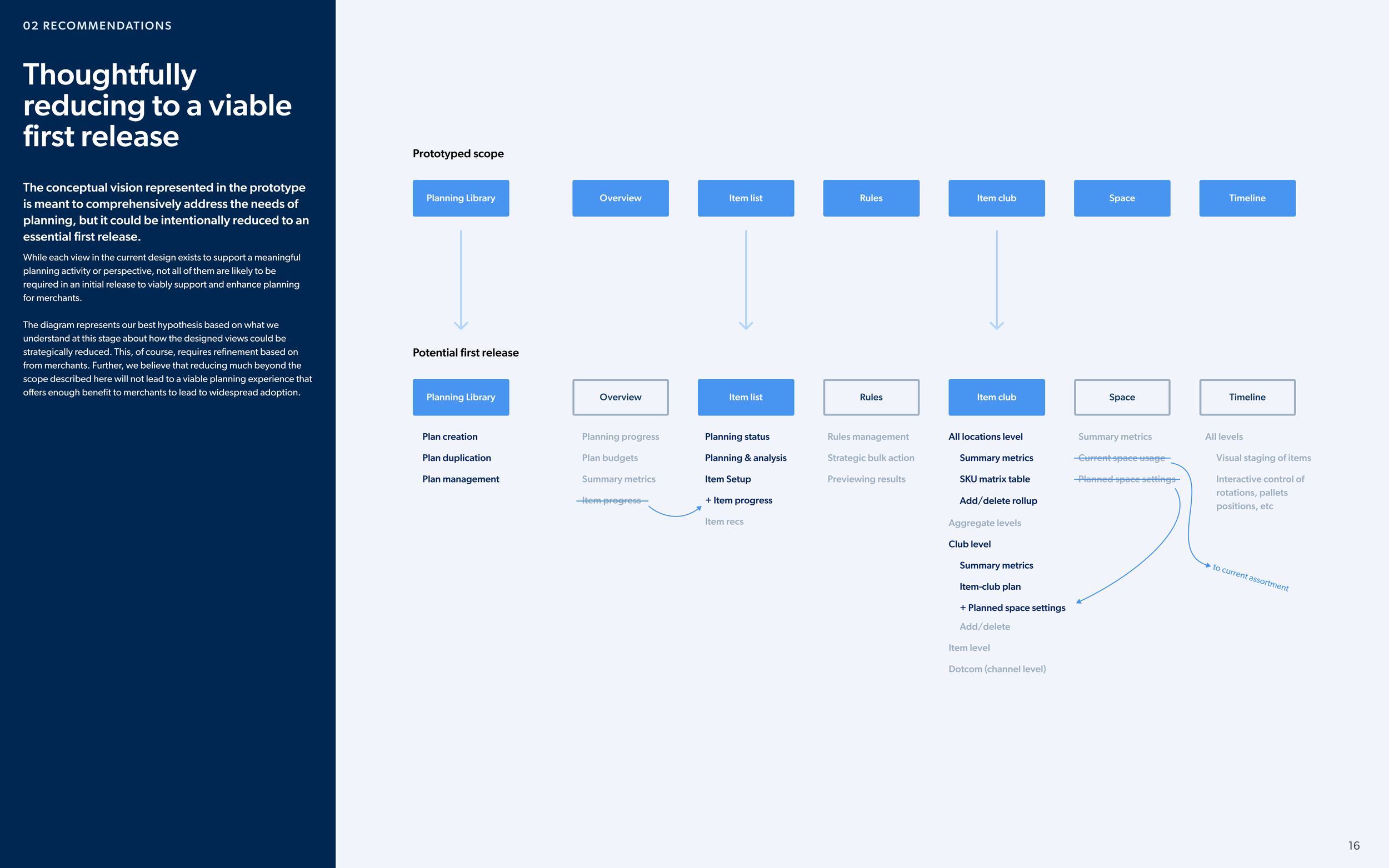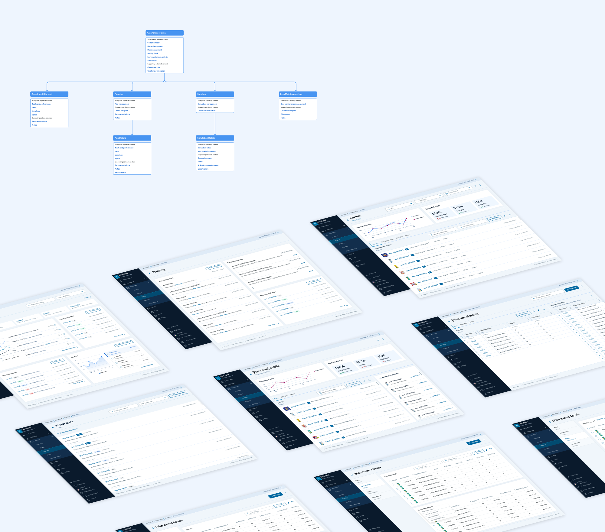 These maps included our initial understanding about how item data would need to flow between each view and propagate downstream throughout the planning process. We also mapped out an architecture of the features and capabilities required in each view to align the team on scope moving forward.