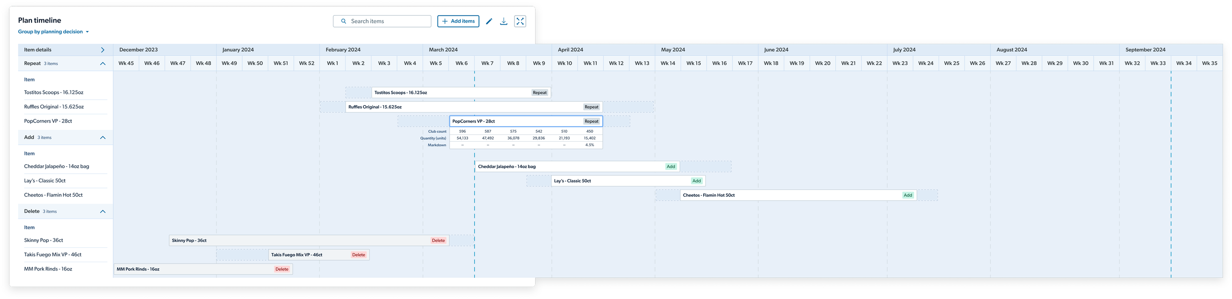 We introduced the timeline concept as its own tab within the Planning tool, giving the merchant a visual representation of the items in their plan and a sense of how long each item will occupy their assortment in the upcoming season at different scopes.