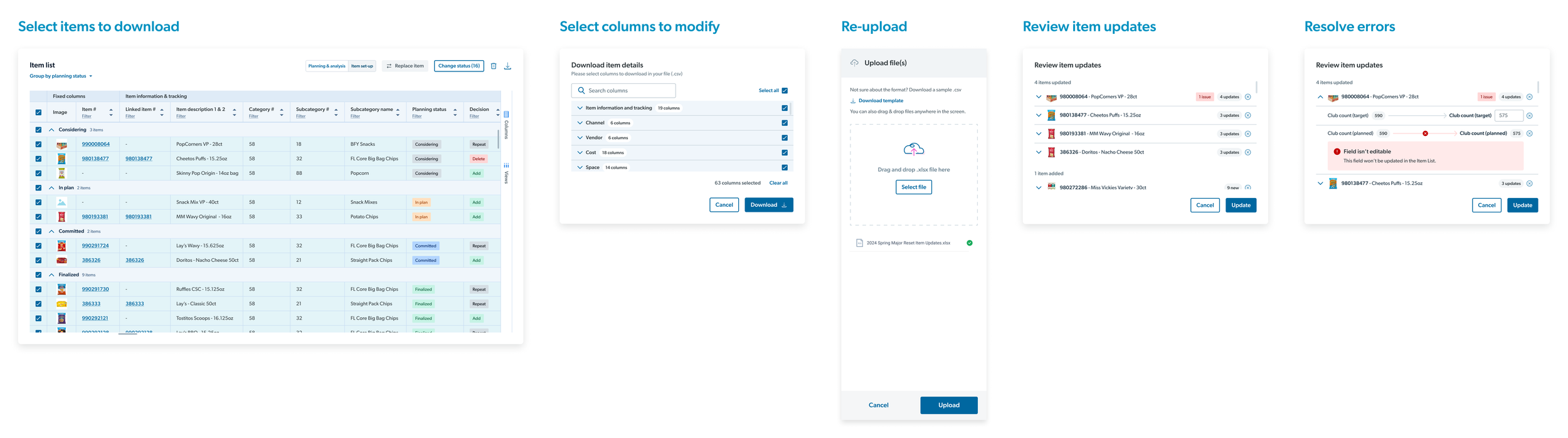 Another way we amplified the connection with excel is by allowing users to either edit directly in the tool or through targeted bulk downloads. By choosing items and data fields to download into a custom template, make bulk changes within excel, and then re-uploading the file, it allows the user to make large-scale changes in a much shorter amount of time and embraces how this product can communicate with excel instead of being a replacement for it.