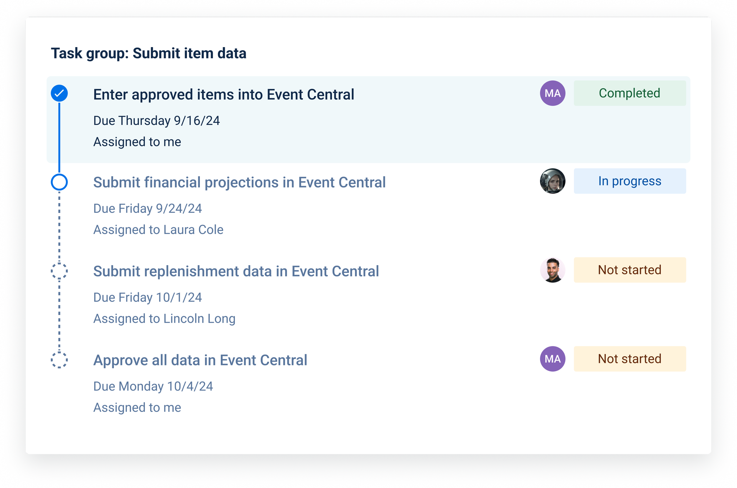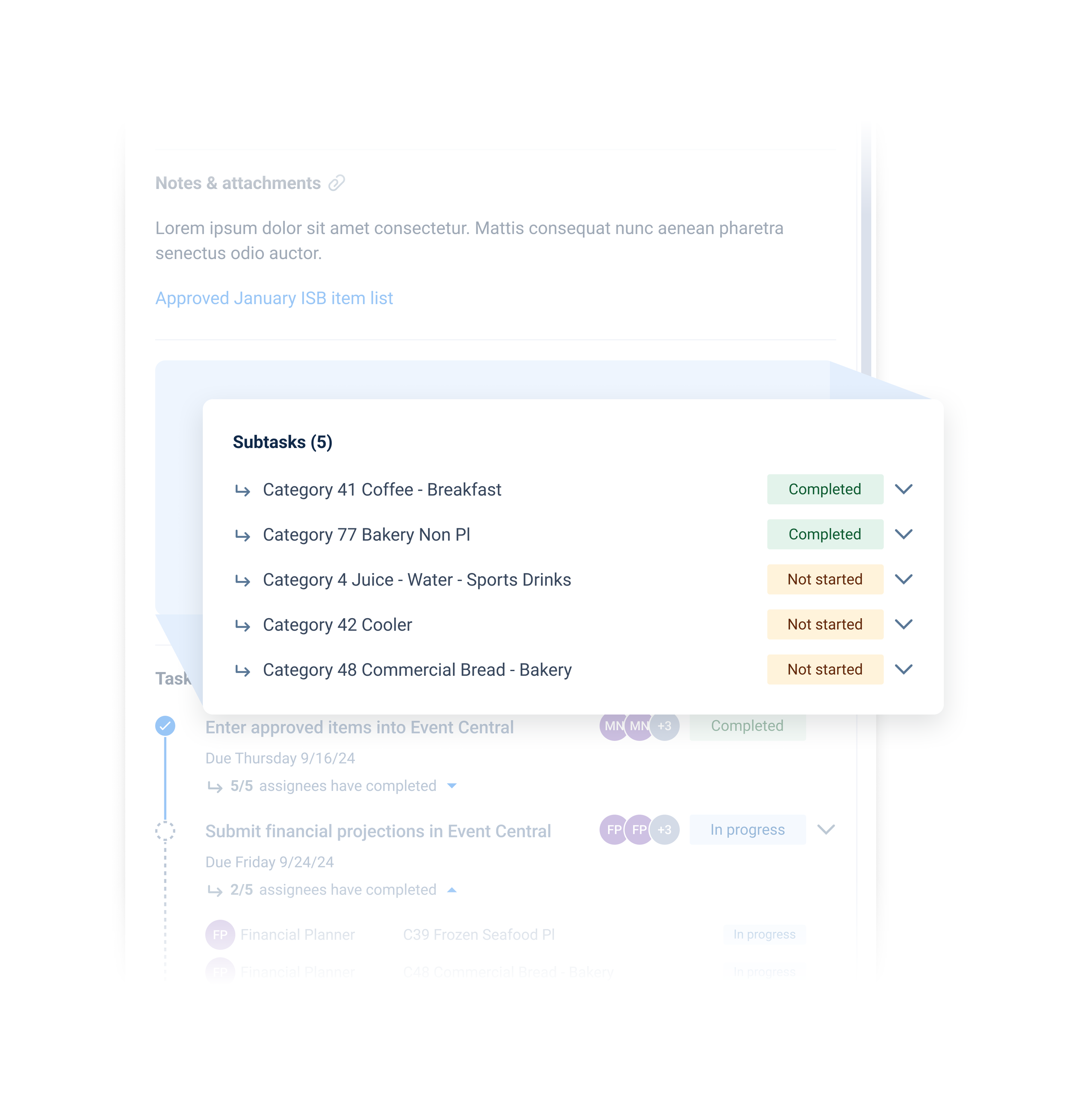 We created a dashboard for task creators who needed to monitor progress across tasks of different workflows, like Marketing teams monitoring all tasks related to setting up different events. This view allowed them to gauge how on-track events were based on task progression, and allowed them to drill into individual tasks to see a breakdown of assignee progress, so they could be immediately aware of any blockers.