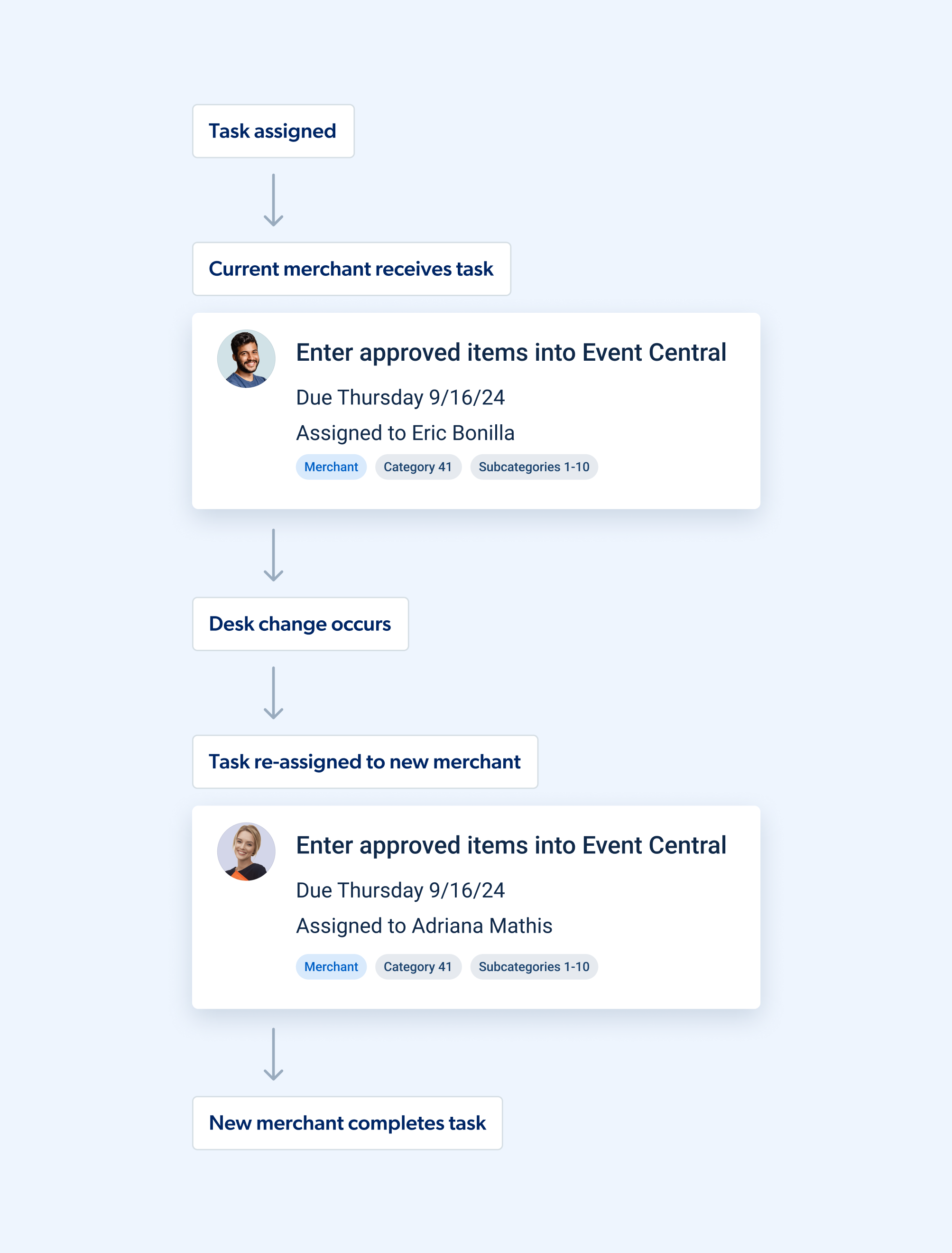 It also allowed for the system to adapt when a user went on a leave of absence or changed their desk (category), by re-assigning it to the new person that fit those same requirements, so that the workflows we established in the system wouldn’t become outdated or broken.