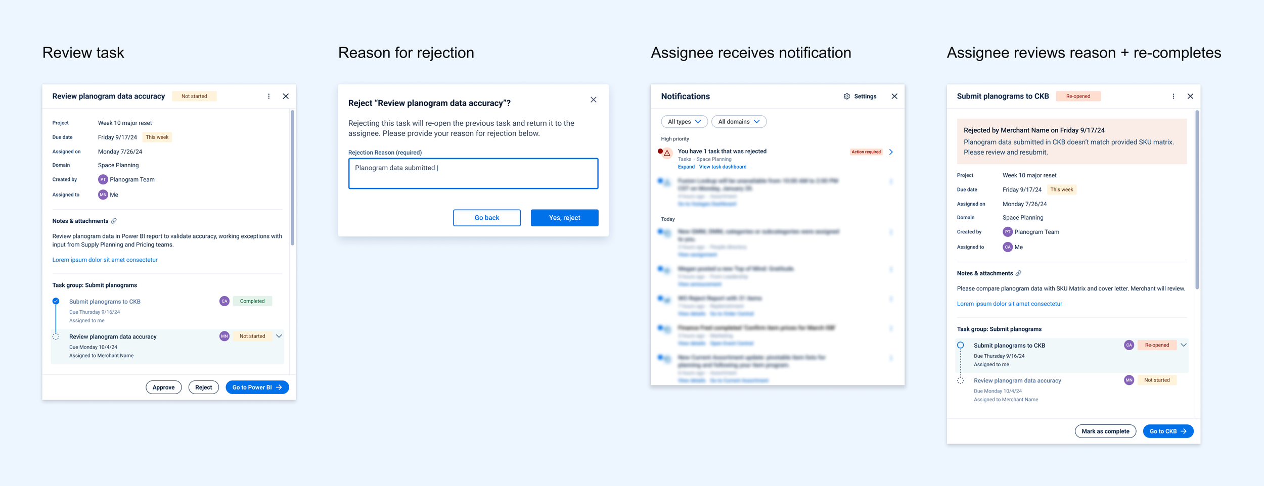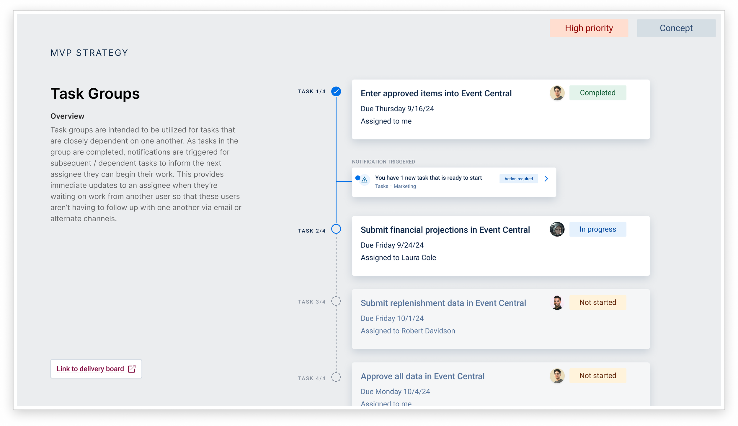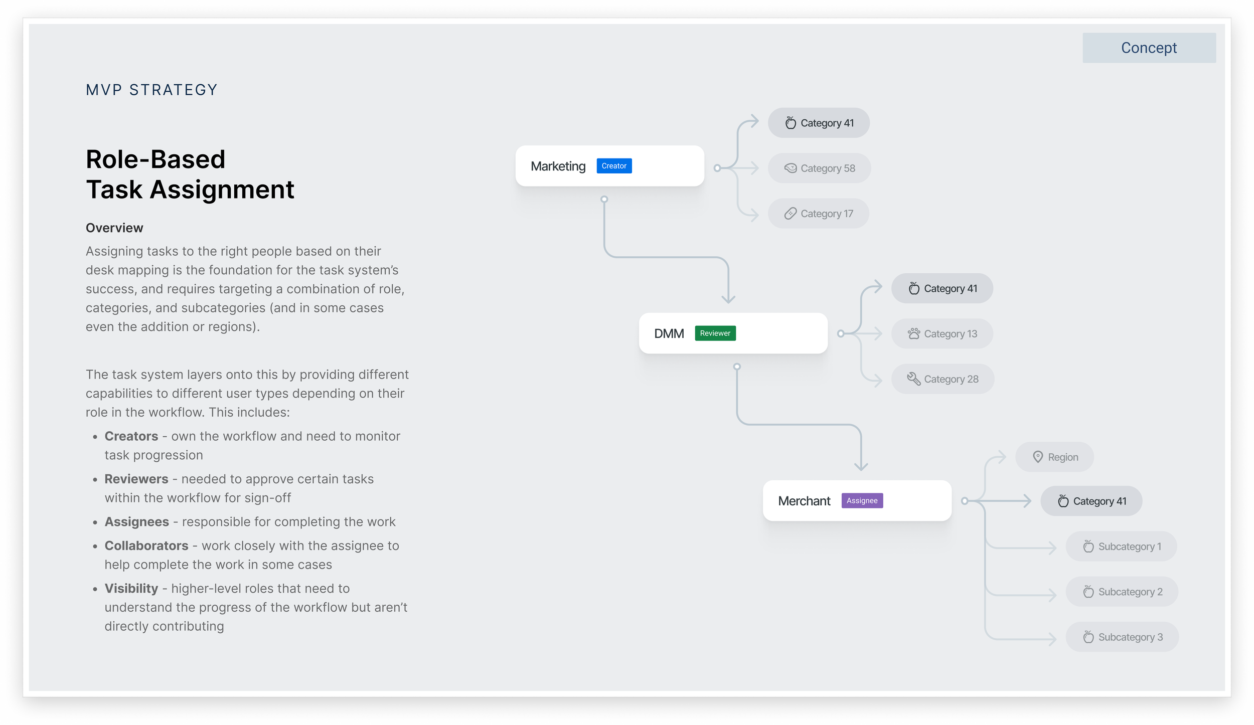 Concept deliveryExpanded to encompass the end-to-end task lifecycle—from task assignment, to in-app status triggers, to approvals and rejections. Incorporated multi-user collaboration and visibility across workflows and user roles at different scopes.