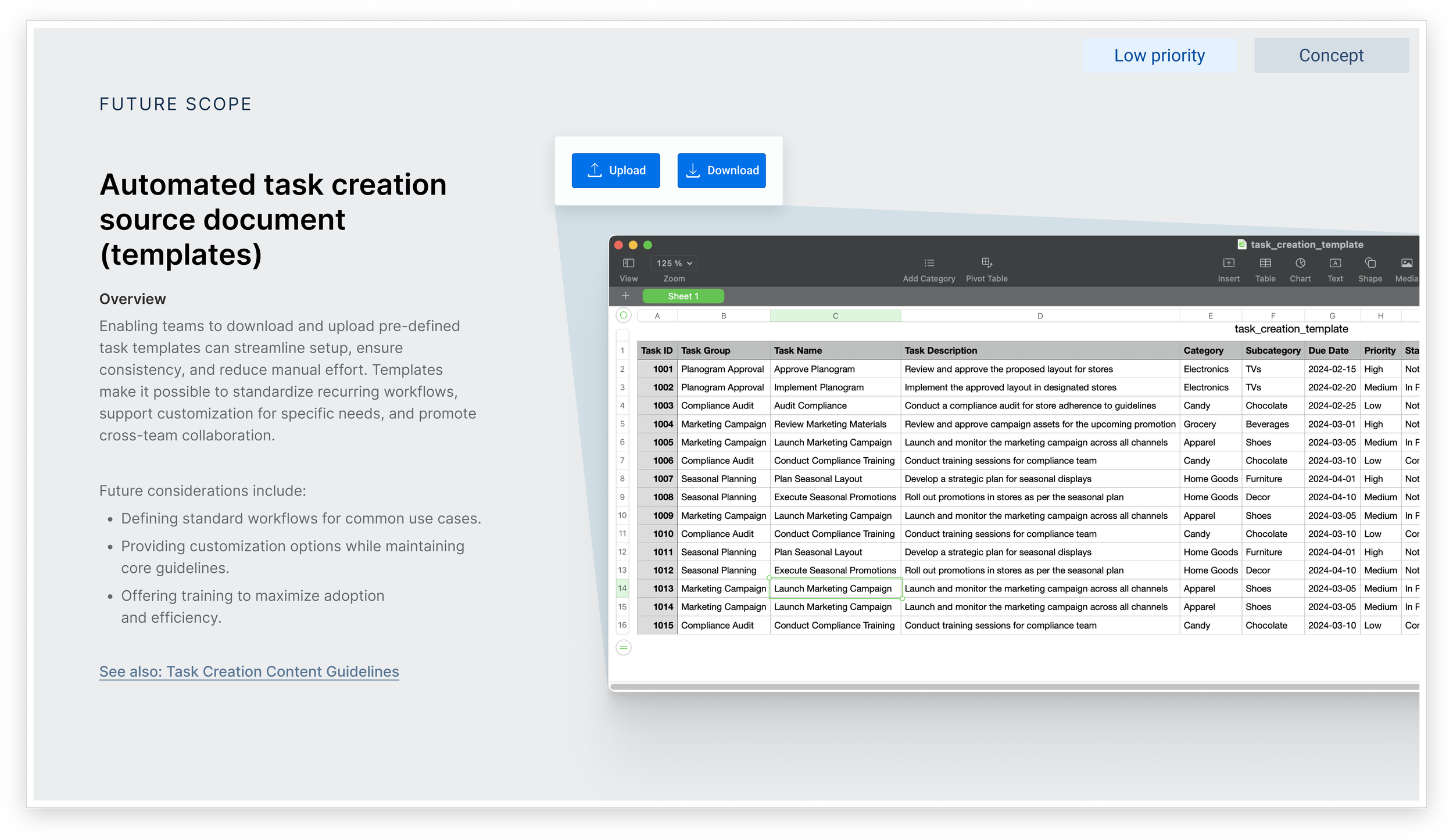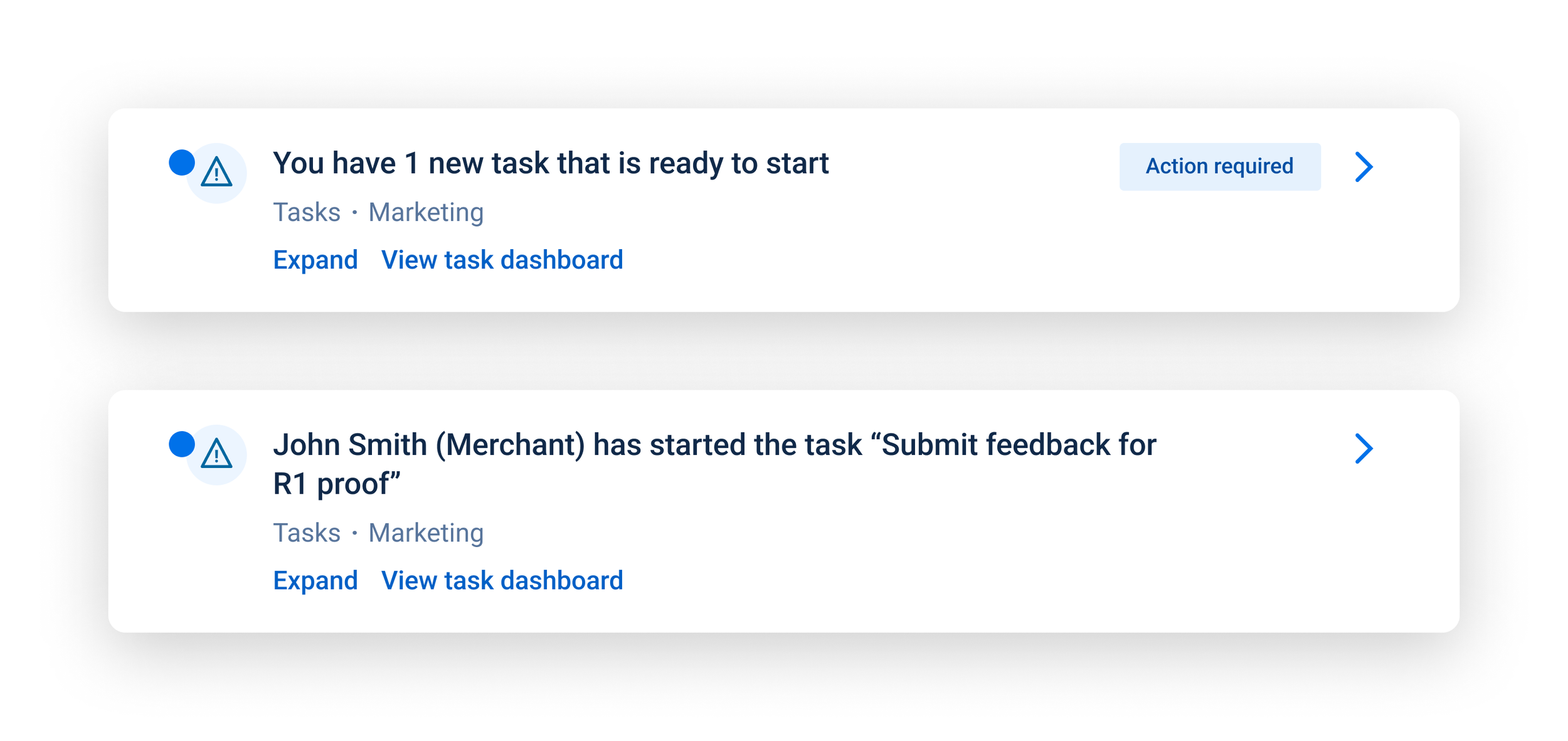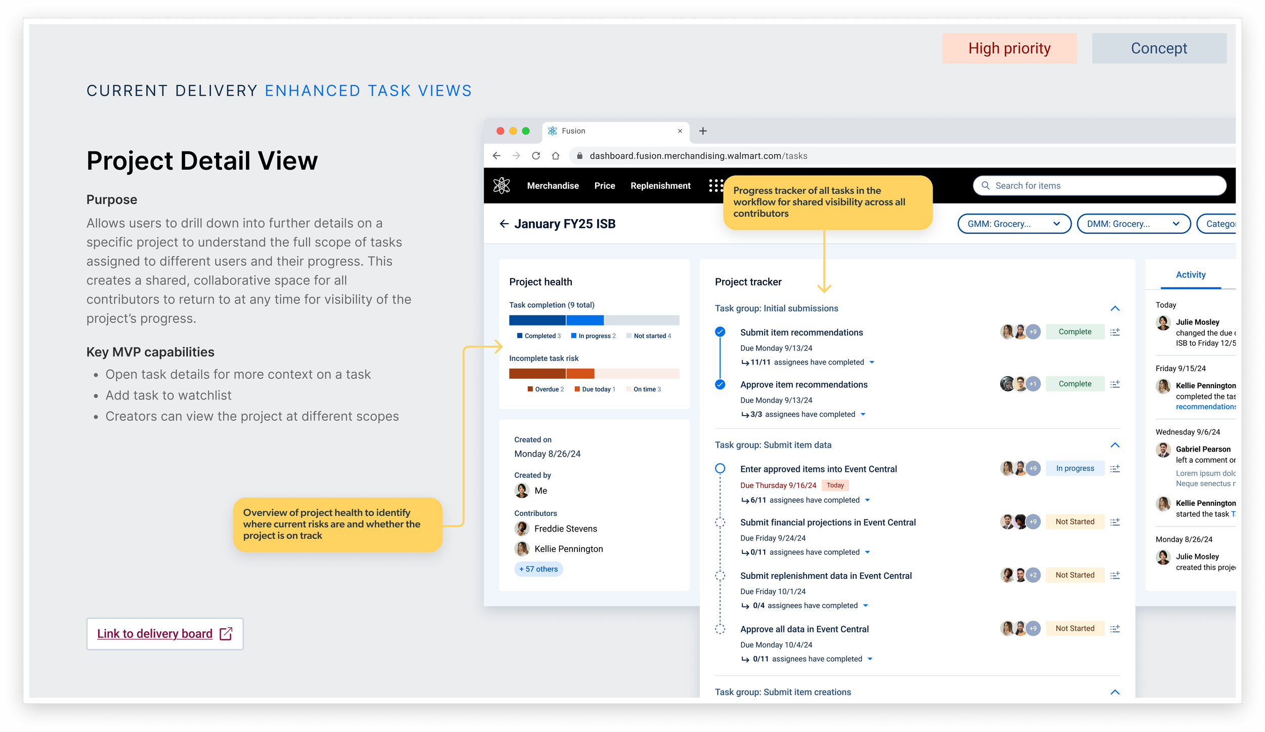Concept deliveryExpanded to encompass the end-to-end task lifecycle—from task assignment, to in-app status triggers, to approvals and rejections. Incorporated multi-user collaboration and visibility across workflows and user roles at different scopes.
