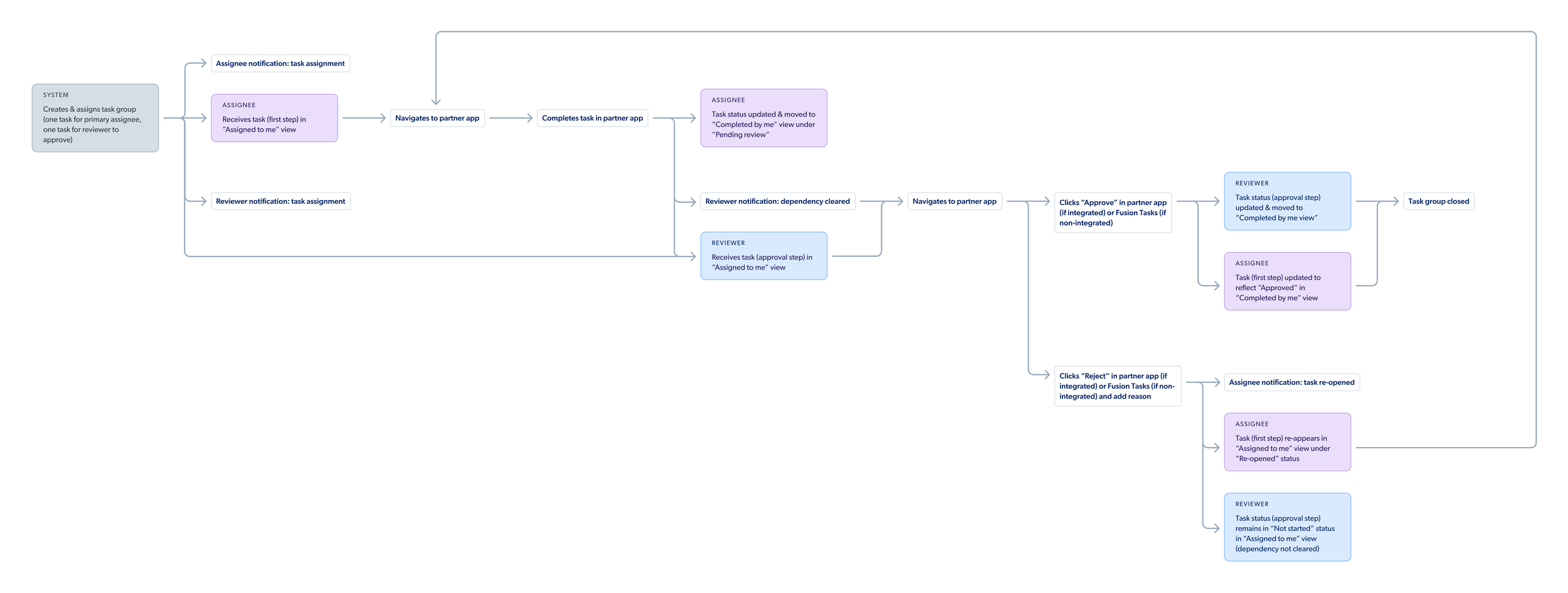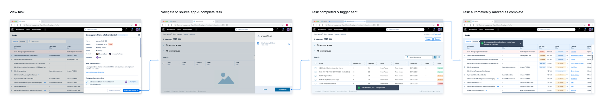 We worked with our engineering partners to understand available triggers in existing partner applications that could be leveraged to automatically update the status of tasks, keeping the task system communication as real-time as possible and lessening work for users to navigate back to Fusion and manually mark tasks as complete.