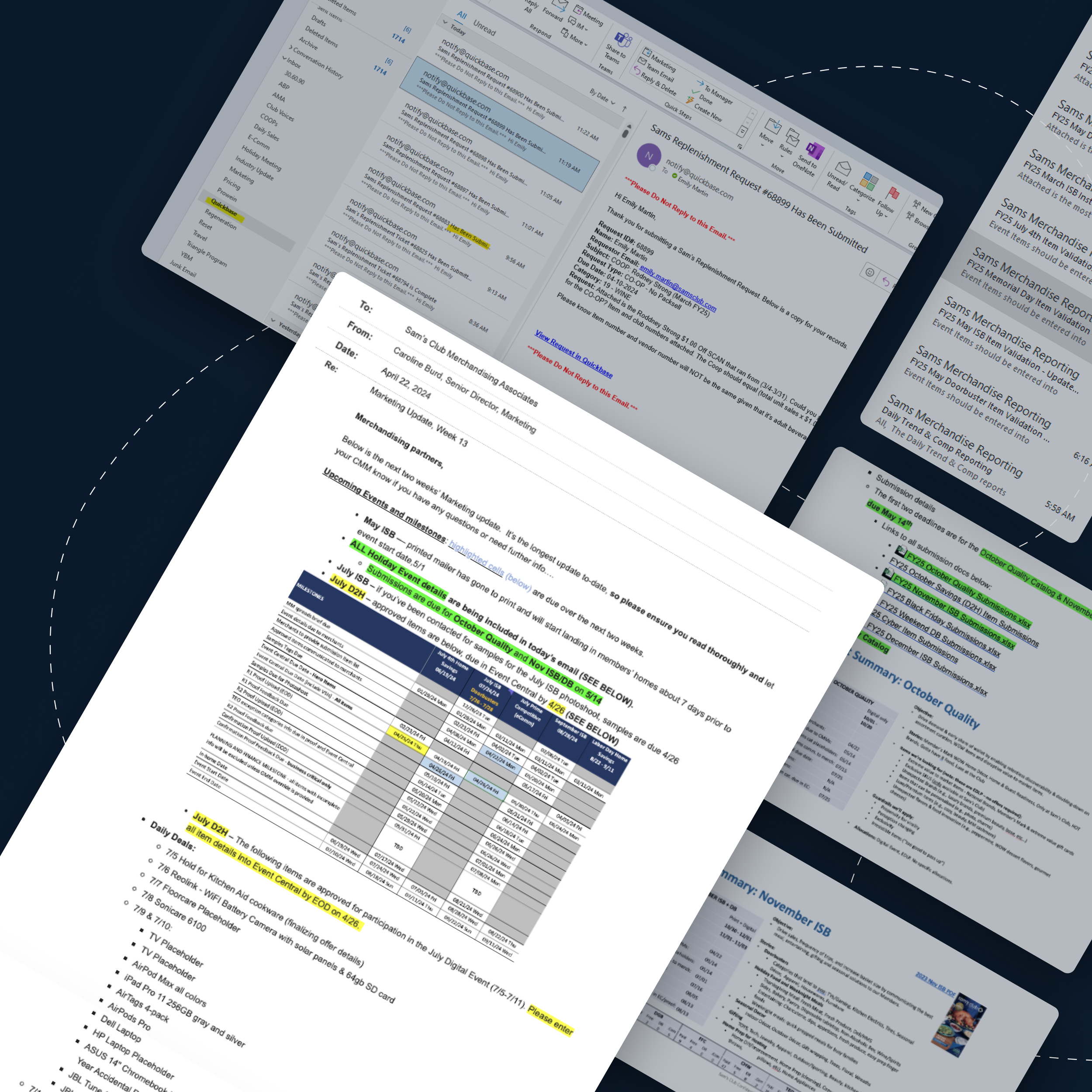 For the majority of their workflows, we saw that merchants spend hours reading through hundreds of emails about what tasks need to be done, what is actually relevant to them personally, follow-ups and check-ins with others, requesting status updates, and generally trying to maintain an awareness of what is in-flight across their category.