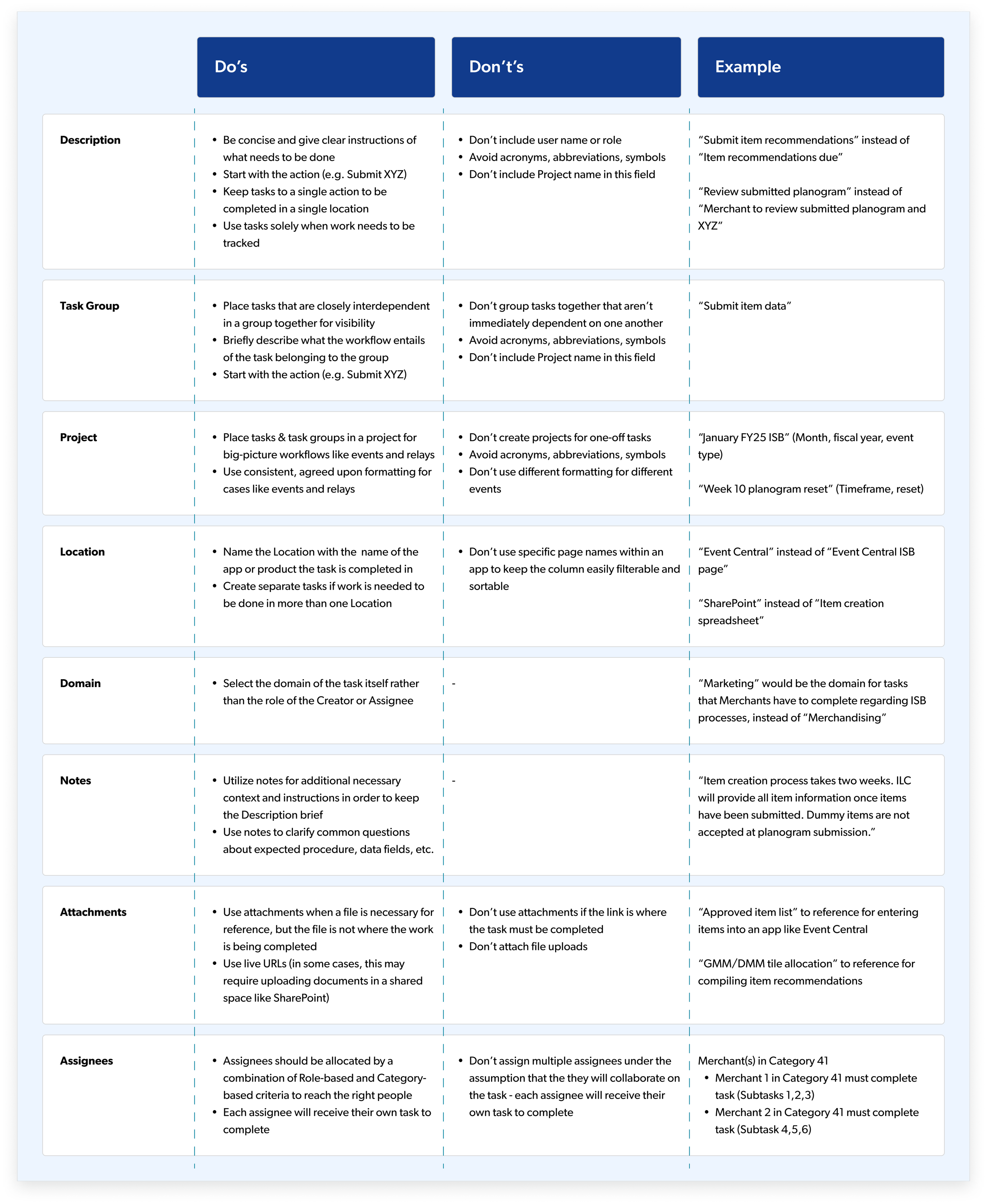 We broke down the fields attached to a “task” in this system and created guidelines around the do’s and don’t’s for each field, with specific examples.