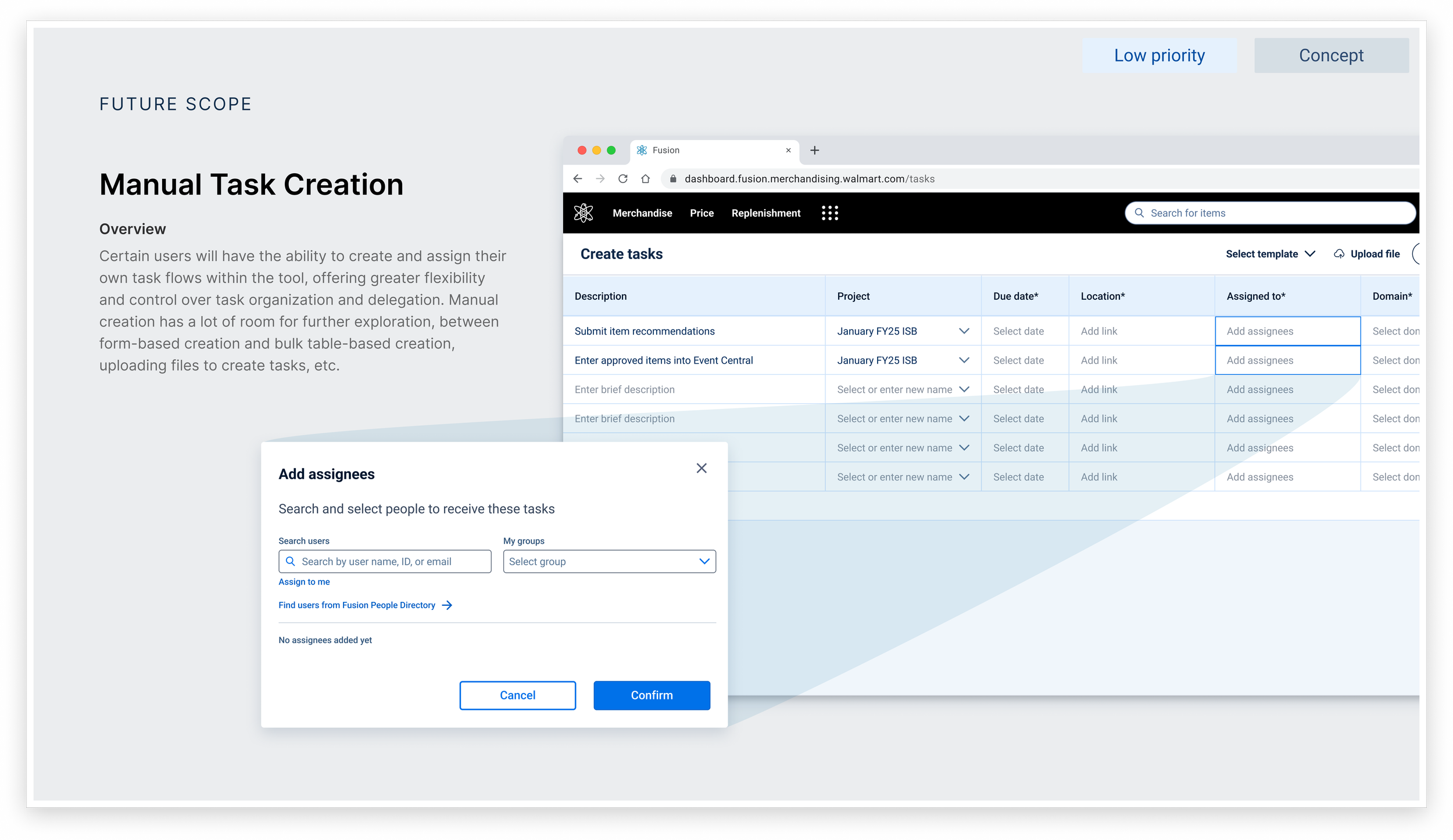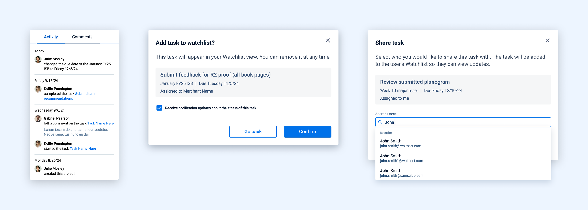 When looking at competitor task-tracking applications on the market, we quickly realized these use cases were a lot more complicated than what we audited, where tasks were assigned from one individual to another. Instead, tasks at Sam’s Club were often assigned from an entire team that requires shared visibility, like Marketing, and sent out on a category-basis, meaning each merchant needed to receive their own task to complete.