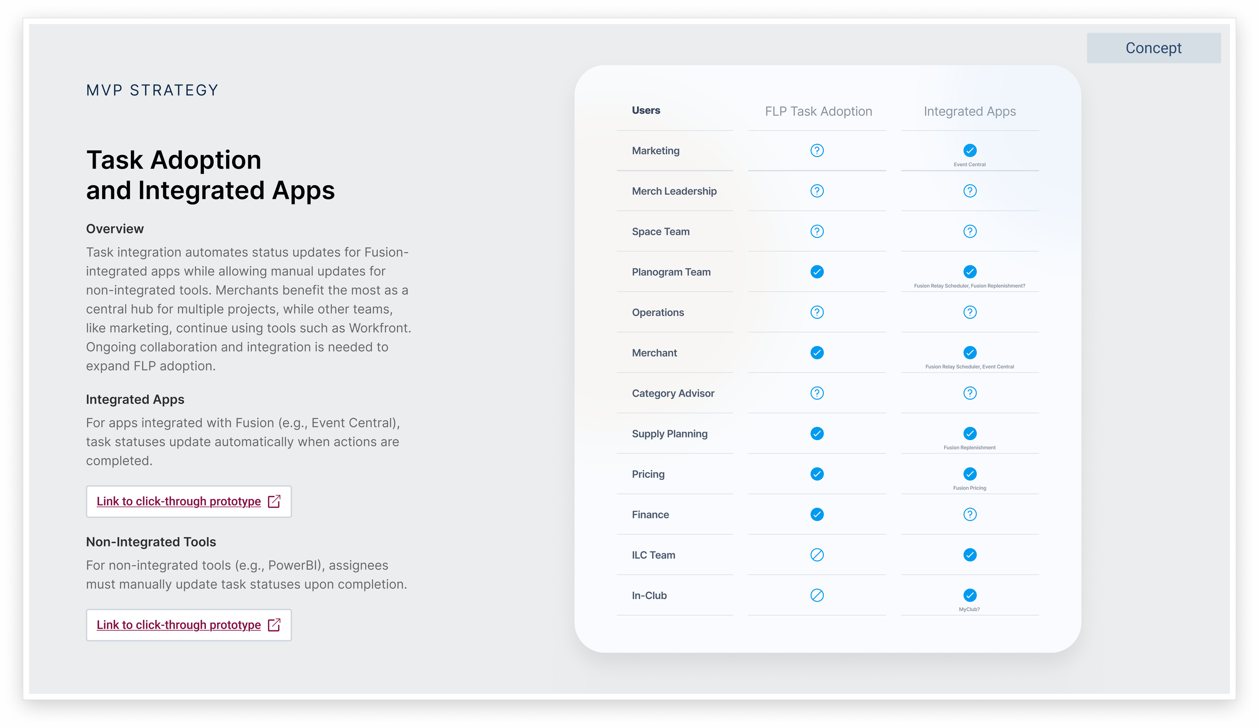 We also delivered detailed workflows to create a system that seamlessly worked with both Fusion Launchpad apps and non-integrated tools—such as external spreadsheets—including key merchant workflows like event preparation and planogram creation.