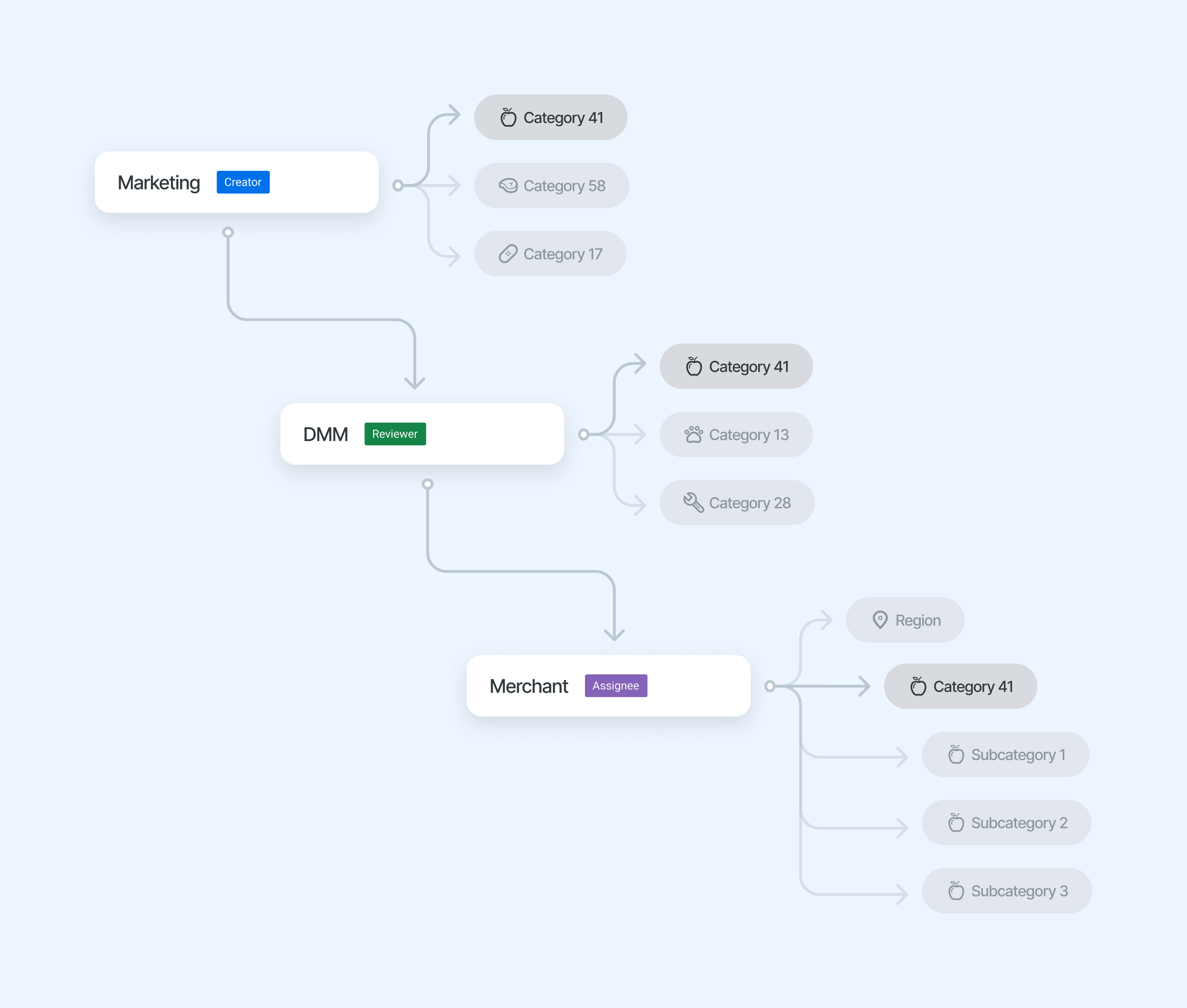Through analyzing user workflows, we realized the task system needed to provide different scopes of communication and monitoring based on different user roles and their category groupings—from teams who need to monitor task progress across all users and categories, to a manager who needs to review and sign-off on the task for a smaller subset of categories, to an individual contributor who needs to complete the task for a single category.